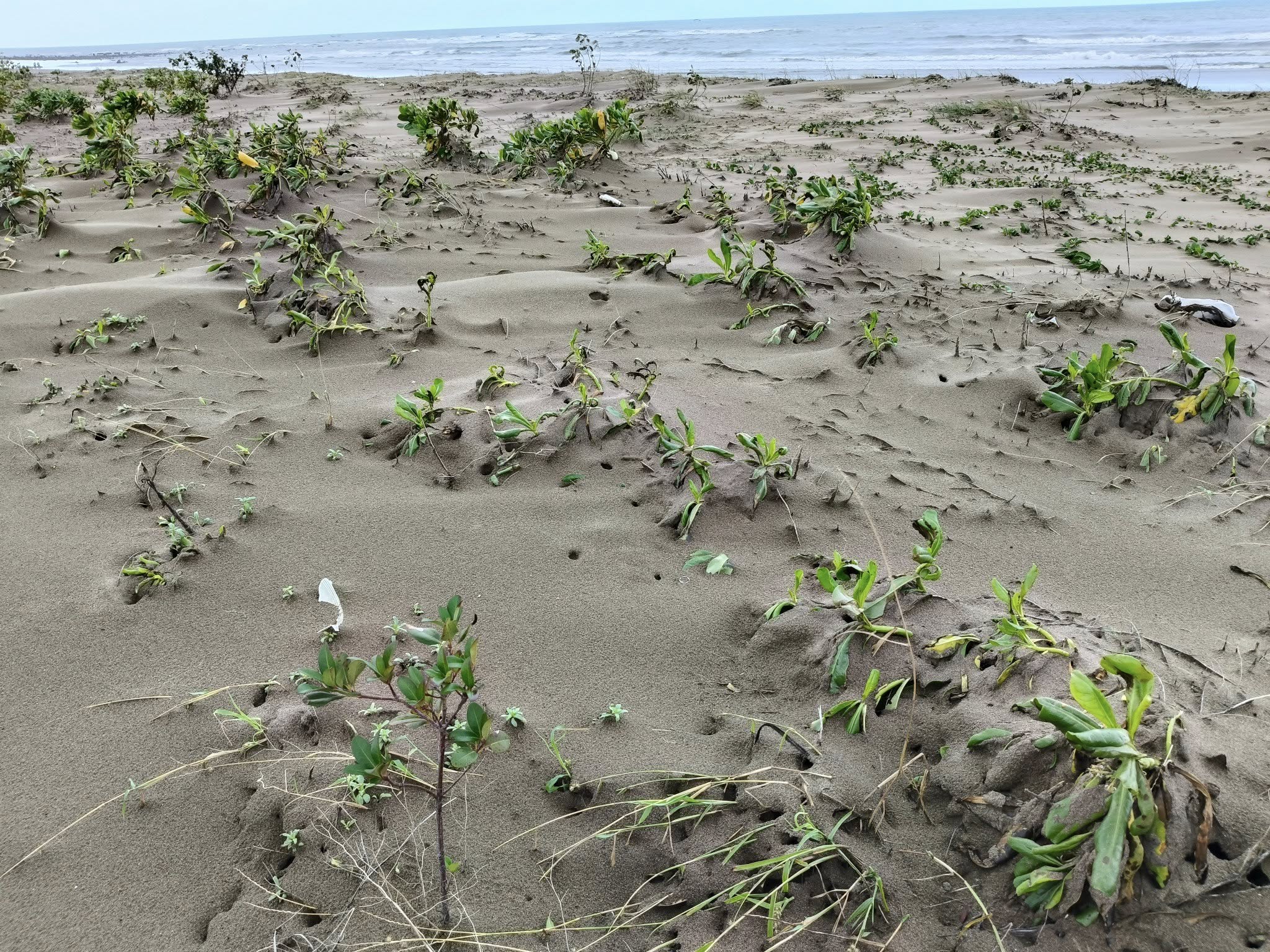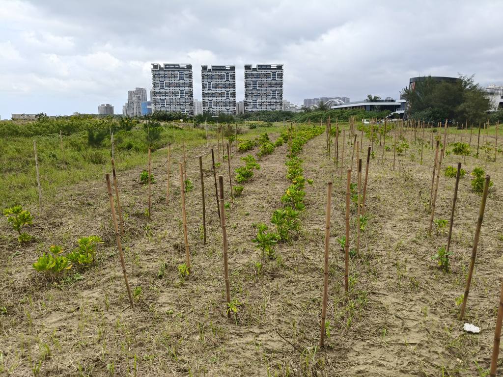 經現場觀察,確認並非苗木消失,而是受到季風及海砂堆積影響,被沙層掩埋。受影響的面積相當廣,礙於時間無法立即清理,只能期待這些植物能憑藉自身的生命力,突破困境,再度萌發。