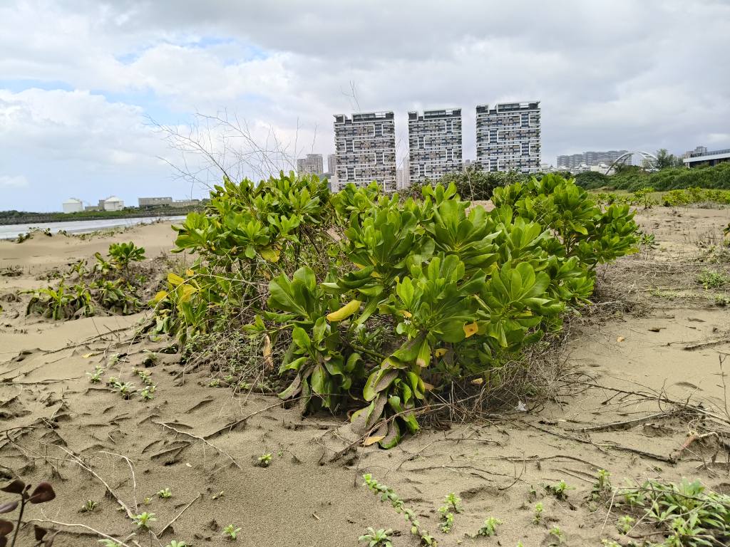 10月29日,我們前往淡水沙崙海岸進行現場勘查,原本期待能看到造林區綠意盎然的景象,但映入眼簾的畫面卻令人相當驚訝——靠近海岸第一線的苗木大多被厚厚的沙石覆蓋,僅有部分草海桐仍頑強地露出綠色葉片。