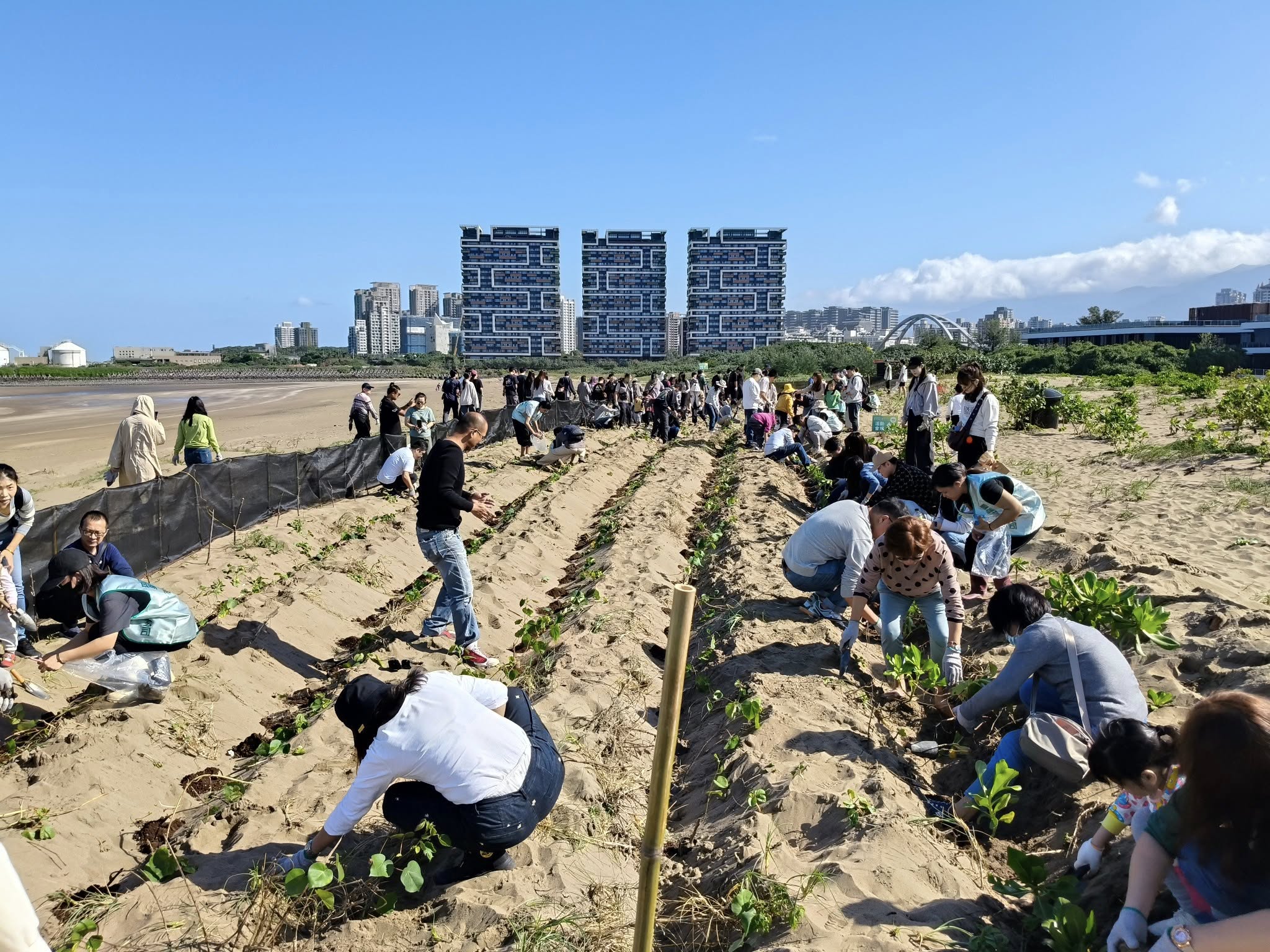 今天的淡水沙崙海岸可謂是風和日麗,氣溫涼涼的,而且令人訝異的是,風也不會太大,這是辦理種樹活動的好天氣。 我們帶著200位貴賓,一起種下600株苗木,主要是黃槿,還有部分的草海桐。 愛種樹公司的前置作業,做了將近3天,但貴賓們不到15分鐘就將全部的苗木種好 ,並開始澆水。顯見這是一家很有紀律的公司,辦事效率非常高。 令人高興的是,沙崙海岸今天下午開始下雨,而且聽說要連下三天,這可以大大減輕我們澆水的壓力,感謝老天爺的幫忙。