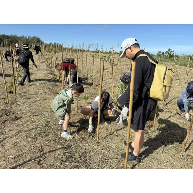 活動當天,校友們帶著家人一同參與,許多孩子也加入其中。小朋友們專注地拿著鏟子、灑水、拍土,動作雖然略顯生疏,卻充滿認真與投入。那份純粹的專注與對土地的敬意,讓現場多了一份靜謐又感動的氛圍。看著一棵棵小樹苗在孩子們的雙手下穩穩立起,彷彿看見希望正從泥土中緩緩萌芽。