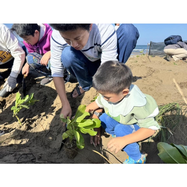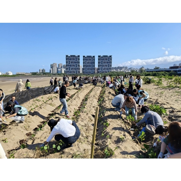 今天的淡水沙崙海岸可謂是風和日麗,氣溫涼涼的,而且令人訝異的是,風也不會太大,這是辦理種樹活動的好天氣。 我們帶著200位貴賓,一起種下600株苗木,主要是黃槿,還有部分的草海桐。 愛種樹公司的前置作業,做了將近3天,但貴賓們不到15分鐘就將全部的苗木種好 ,並開始澆水。顯見這是一家很有紀律的公司,辦事效率非常高。 令人高興的是,沙崙海岸今天下午開始下雨,而且聽說要連下三天,這可以大大減輕我們澆水的壓力,感謝老天爺的幫忙。